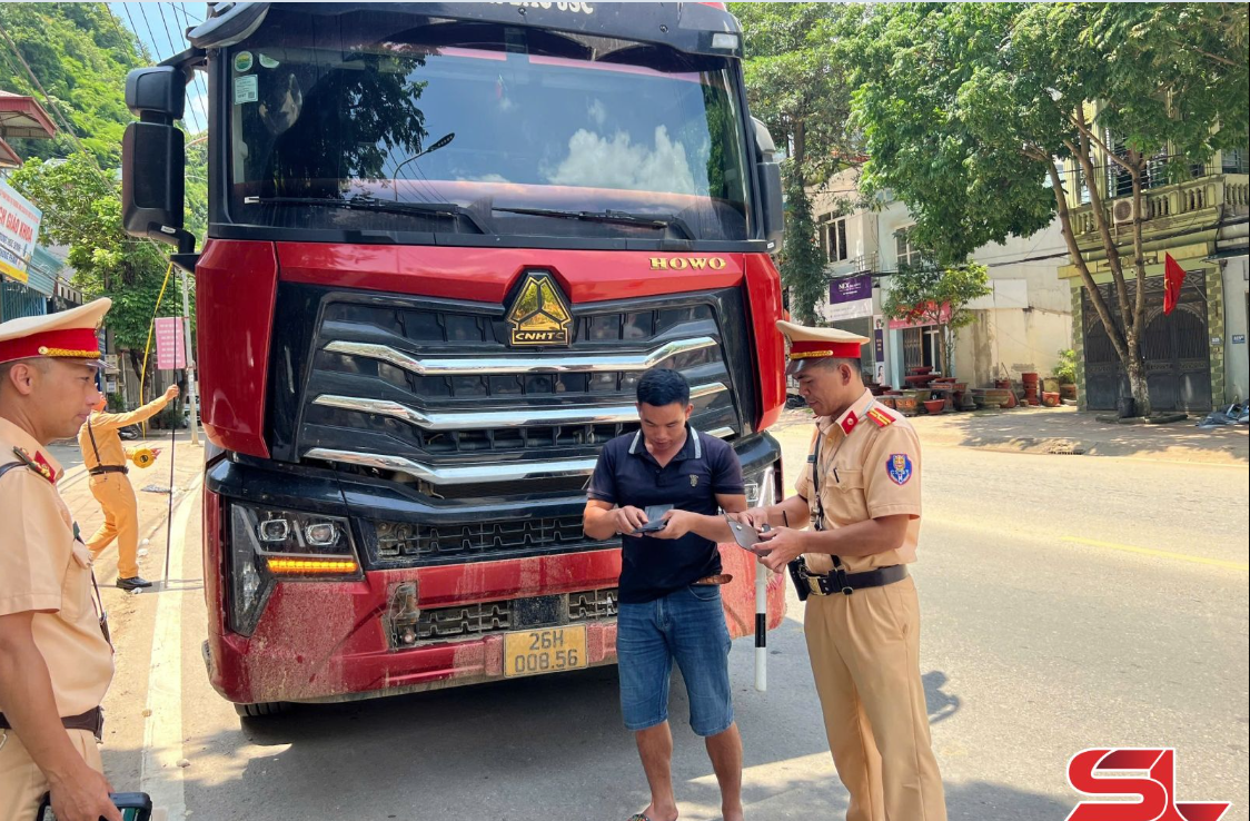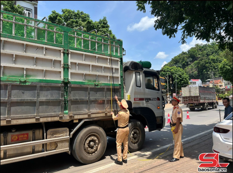 Cảnh sát giao thông Công an tỉnh Sơn La kiểm tra kích cỡ thùng, thành phương tiện giao thông.