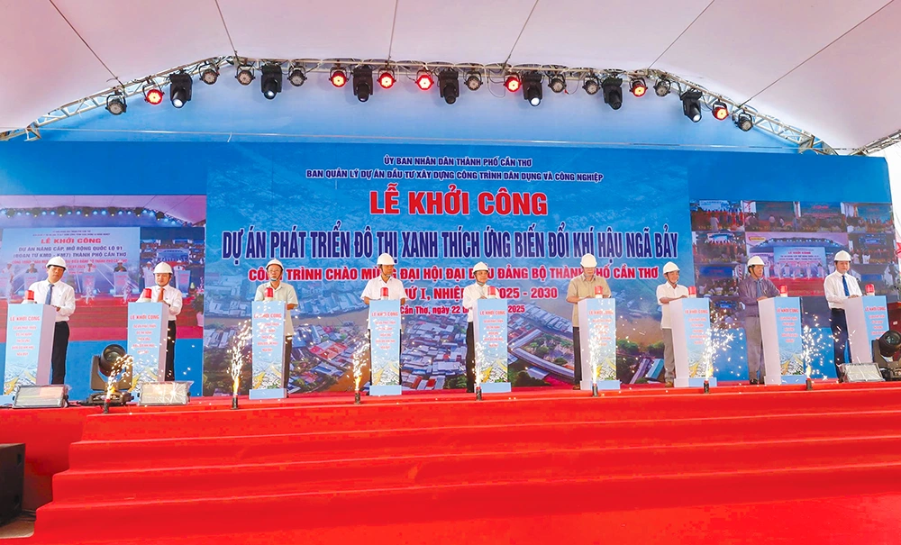Các đô thị ở Cần Thơ phát triển mạnh về lượng và chất. Trong ảnh: Lãnh đạo và nguyên lãnh đạo TP Cần Thơ bấm nút khởi công Dự án phát triển đô thị xanh thích ứng biến đổi khí hậu Ngã Bảy vào tháng 9/2025