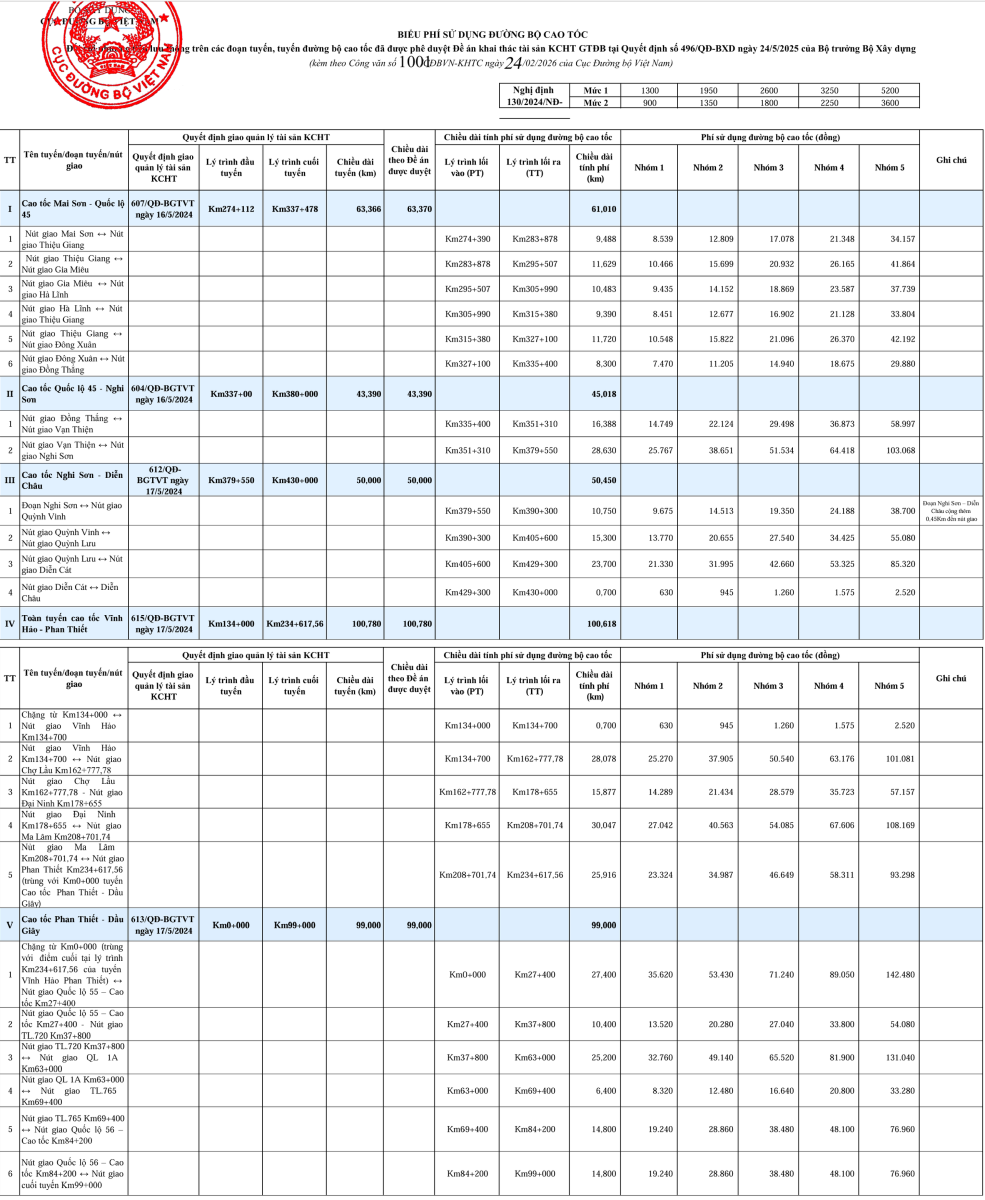 Theo đó, Bộ Xây dựng chấp thuận mức thu phí sử dụng đường bộ cao tốc đối với phương tiện lưu thông trên các đoạn tuyến, tuyến cao tốc: Mai Sơn - Quốc lộ 45, Quốc lộ 45 - Nghi Sơn, Nghi Sơn - Diễn Châu, Vĩnh Hảo - Phan Thiết, Phan Thiết - Dầu Giây theo đề nghị của Cục ĐBVN tại Văn bản số 1001/CĐBVN-KHTC ngày 24/02/2026.
