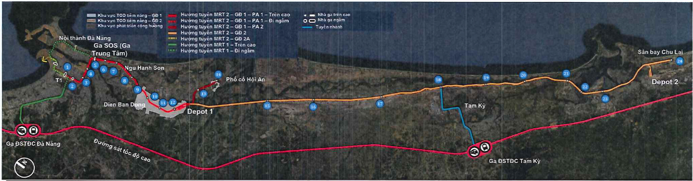 Tuyến kết nối ga đường sắt tốc độ cao với ga Đà Nẵng theo hình thức LRT, có chiều dài 12,3 km; tuyến Hội An - Sân bay Chu Lai theo hình thức MRT, có chiều dài khoảng 70 km, cùng các tuyến khác theo đề xuất của nhà đầu tư, nhằm từng bước hình thành mạng lưới giao thông công cộng khối lượng lớn, kết nối liên hoàn giữa đô thị trung tâm, đô thị vệ tinh và khu vực phía Nam.