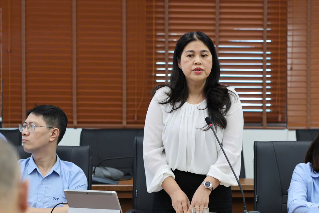 PGS.TS Ngô Thị Thanh Hương - Trưởng phòng Khoa học công nghệ và hợp tác quốc tế báo cáo tại buổi làm việc
