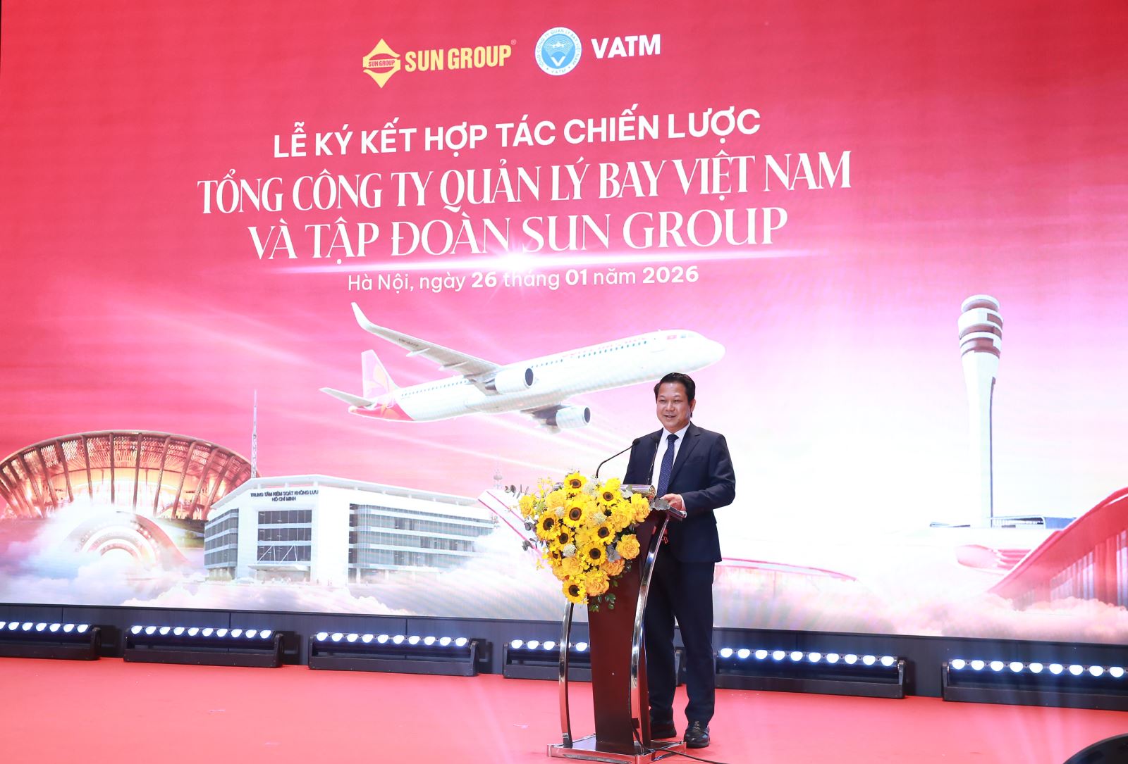 Phát biểu tại buổi lễ, Chủ tịch Hội đồng thành viên VATM Lê Hoàng Minh nhấn mạnh, việc ký kết Thỏa thuận hợp tác chiến lược với Sun Group là bước đi quan trọng, thể hiện quyết tâm đồng hành lâu dài giữa cơ quan bảo đảm hoạt động bay và nhà đầu tư hạ tầng hàng không.