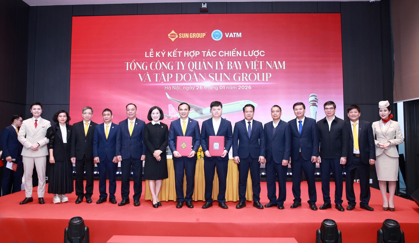 Tổng Công ty Quản lý bay Việt Nam (VATM) và Tập đoàn Sun Group vừa tổ chức Lễ ký kết Thỏa thuận hợp tác chiến lược, đánh dấu bước phát triển quan trọng trong quan hệ hợp tác giữa hai bên, hướng tới mục tiêu nâng cao năng lực và hiệu quả hoạt động hàng không, bảo đảm an toàn tuyệt đối cho các chuyến bay, thúc đẩy đổi mới sáng tạo và phát triển bền vững.