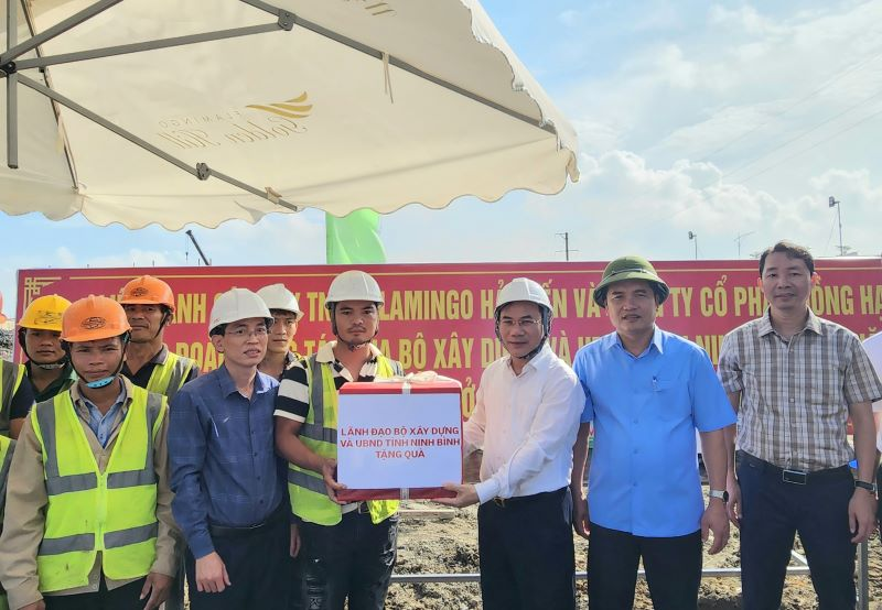 Thứ trưởng Bộ Xây dựng Nguyễn Văn Sinh tặng quà, động viên cán bộ công nhân tại dự án.