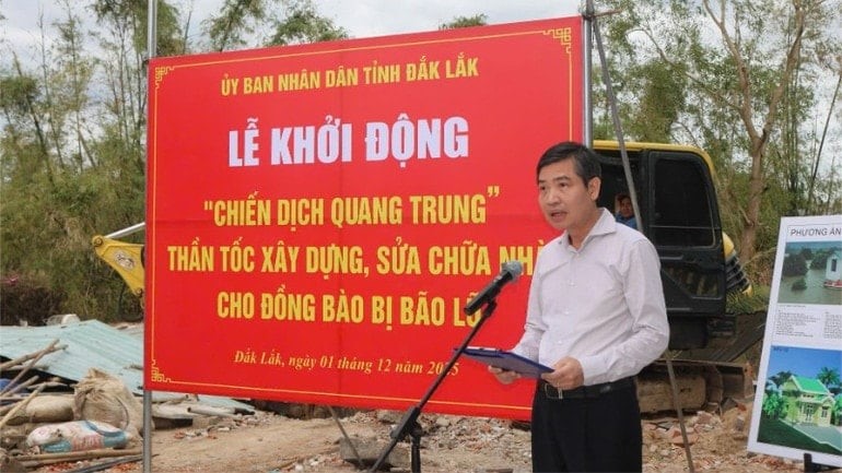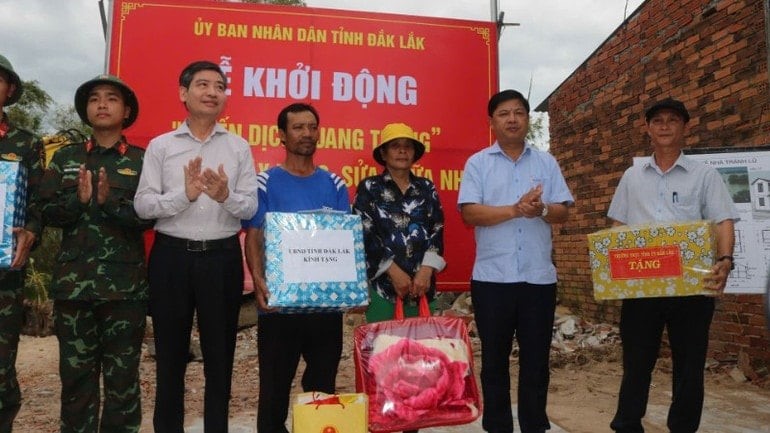 Implementing the Prime Minister 's direction on implementing " Quang Trung Campaign " to quickly rebuild houses for people damaged by floods, on December 1, in Tuy An Bac commune, the People's Committee of Dak Lak province held a launching ceremony of "Quang Trung Campaign" to quickly build and repair houses for people affected by storms and floods.