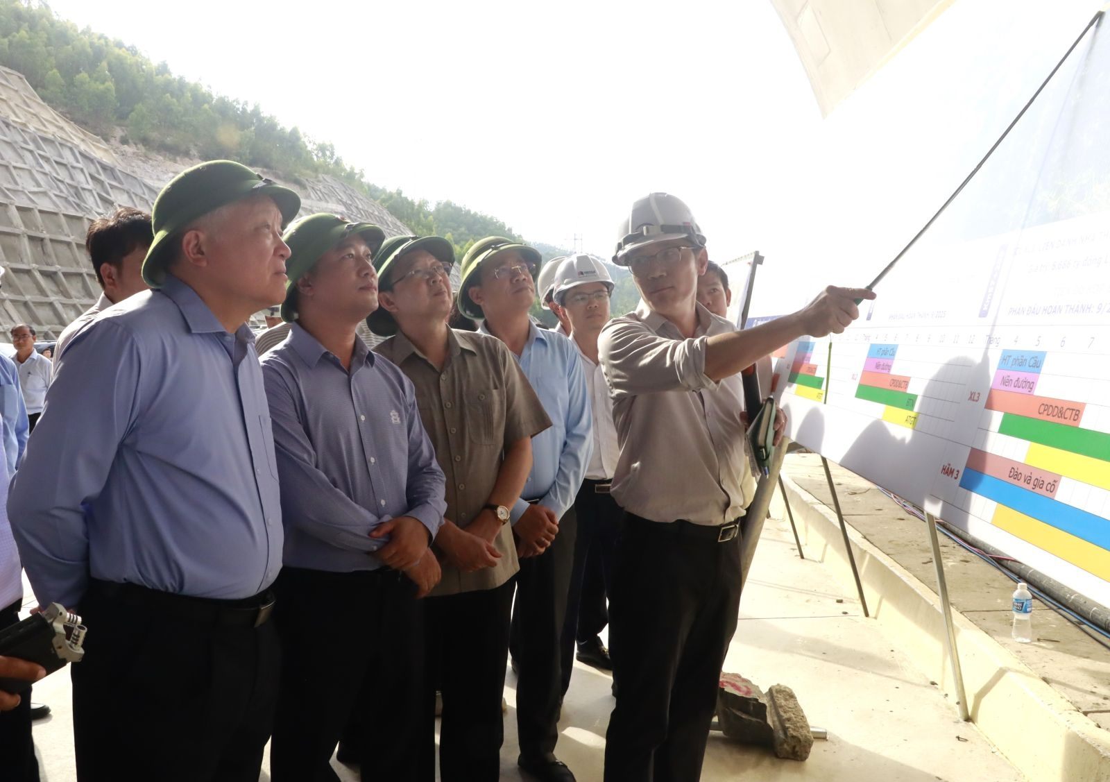 Phó Thủ tướng Thường trực Chính phủ Nguyễn Hòa Bình (thứ 3 từ phải qua), Thứ trưởng Bộ Xây dựng Nguyễn Việt Hùng, lãnh đạo tỉnh Bình Định kiểm tra hiện trường thi công hầm Sơn Triệu, thuộc phường Nhơn Hoà, thị xã An Nhơn