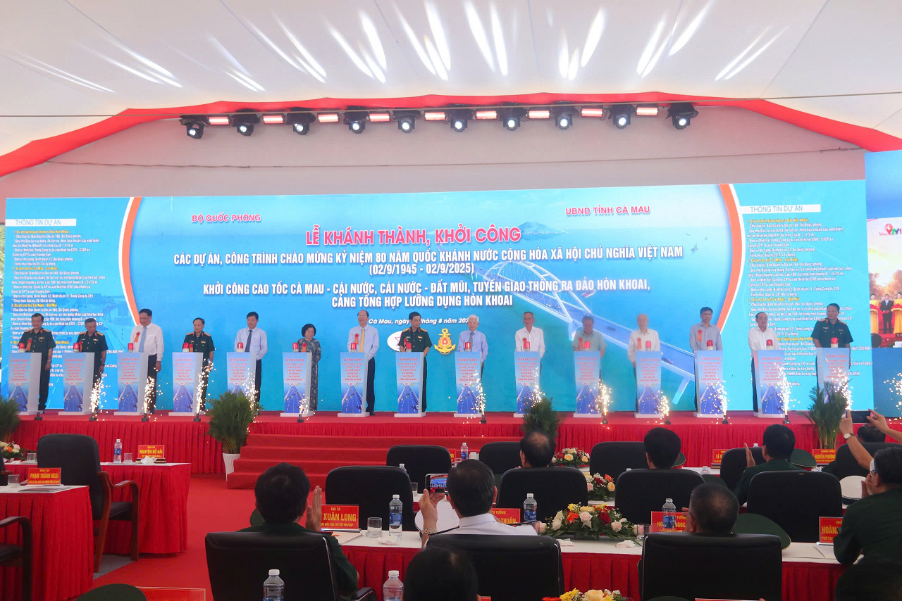 Các đại biểu ấn nút khởi công Dự án xây dựng tuyến cao tốc Cà Mau - Đất Mũi, đường giao thông ra đảo Hòn Khoai, Cảng tổng hợp lưỡng dụng Hòn Khoai tại xã Đất Mũi, tỉnh Cà Mau.