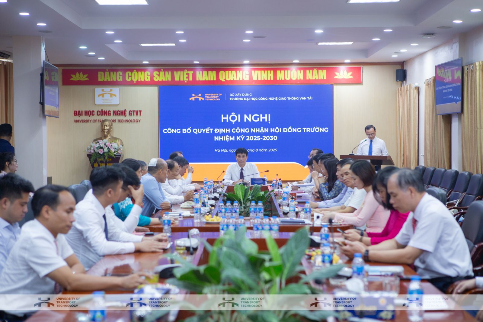 Tại Hội nghị, đồng chí Nguyễn Văn Nghĩa - Phó Vụ trưởng Vụ Tổ chức cán bộ (Bộ Xây dựng) đã công bố Quyết định của Bộ trưởng Bộ Xây dựng về việc công nhận Hội đồng trường Trường Đại học Công nghệ GTVT nhiệm kỳ 2025-2030 gồm 23 thành viên và công nhận Chủ tịch Hội đồng trường là PGS.TS. Vũ Ngọc Khiêm.