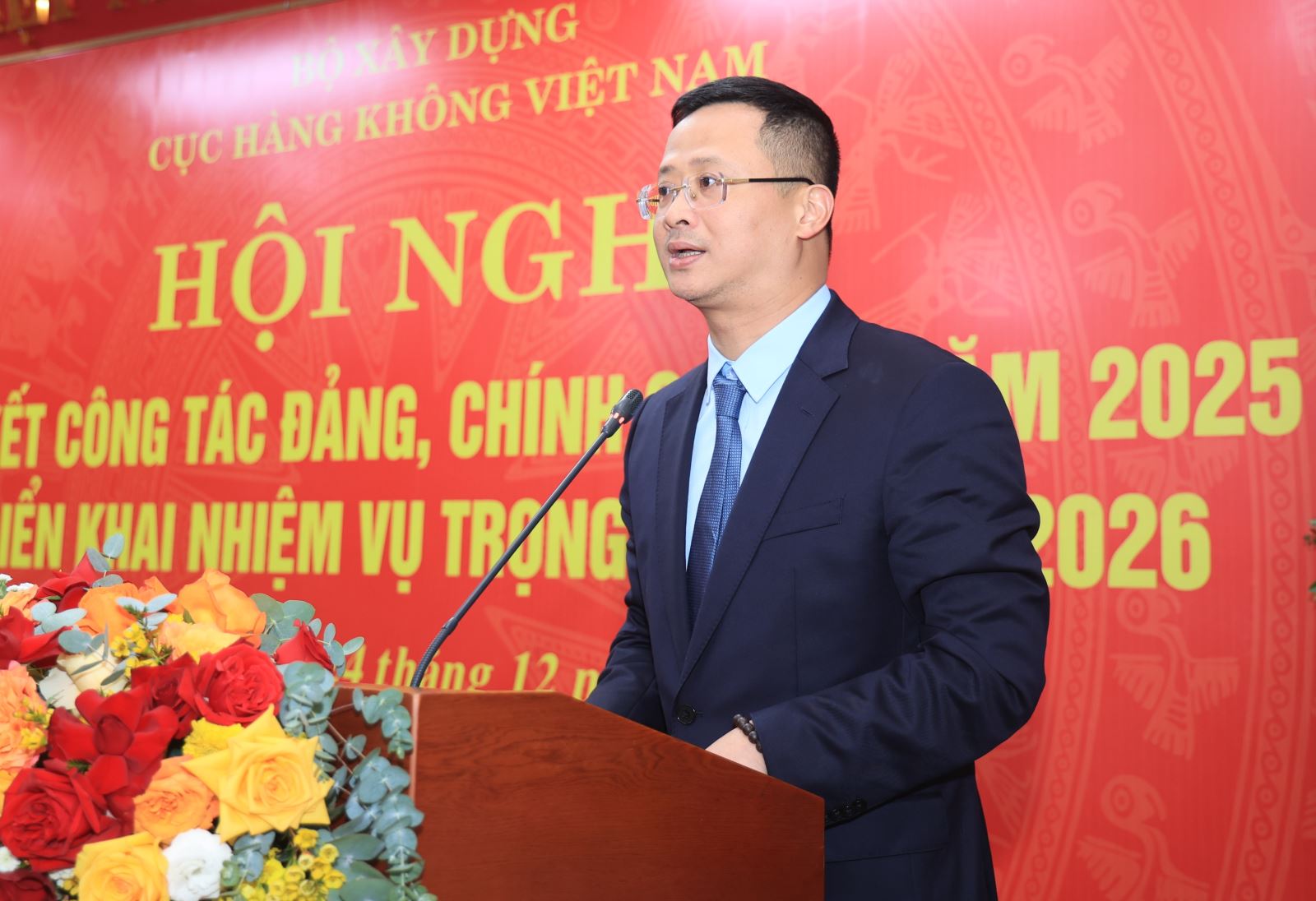 Trước đó, báo cáo tại Hội nghị, Phó Cục trưởng Cục Hàng không Việt Nam Hồ Minh Tấn cho biết: Năm 2025, được sự quan tâm, chỉ đạo sát sao, trực tiếp, toàn diện của Đảng ủy, Lãnh đạo Bộ Xây dựng, Cục Hàng không đã tổ chức triển khai thực hiện kịp thời, quyết liệt, linh hoạt và hiệu quả các nhiệm vụ được giao; được Ban Thường vụ Đảng ủy Bộ Xây dựng ghi nhận, đánh giá cao, trong đó có nhiều kết quả nổi bật.