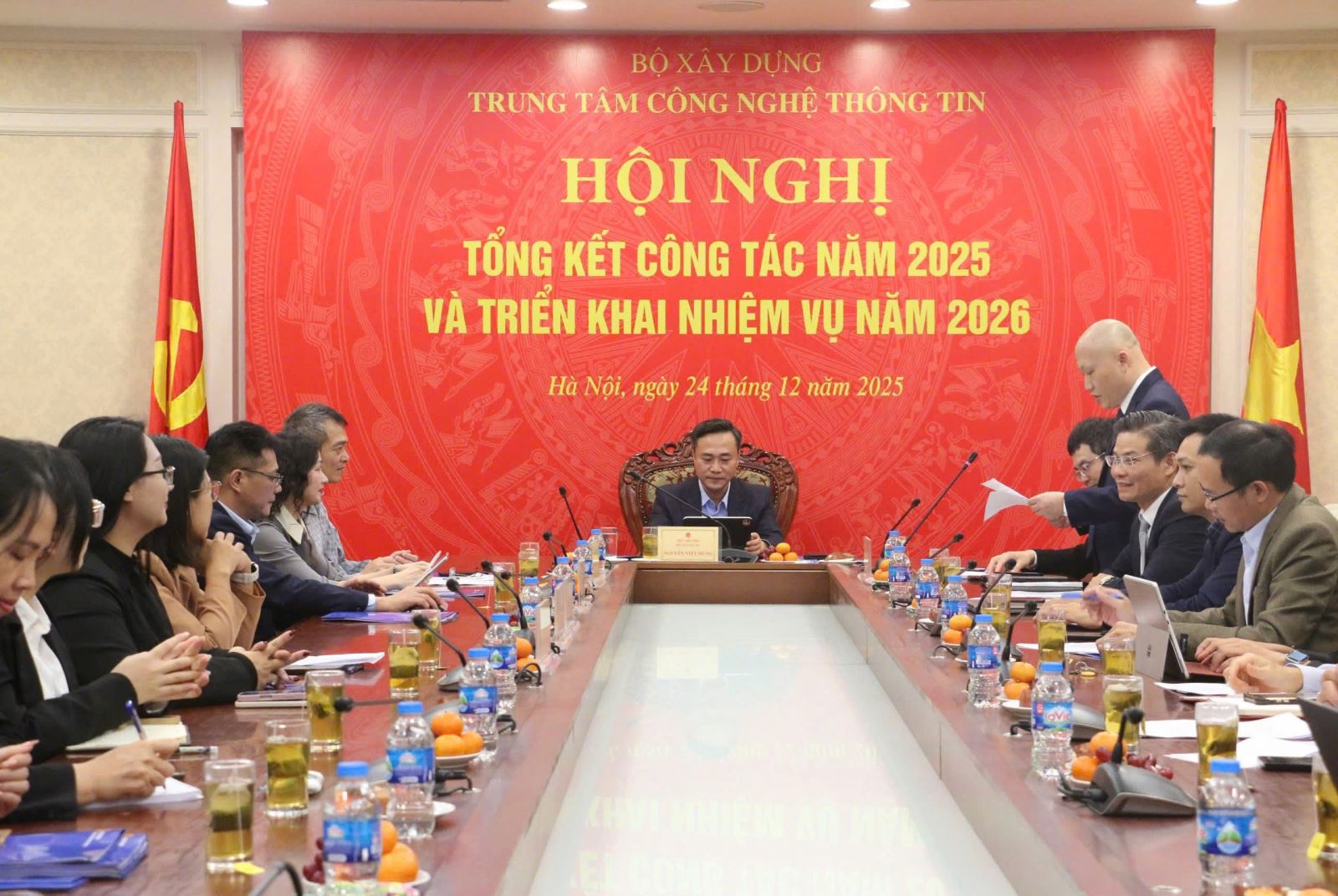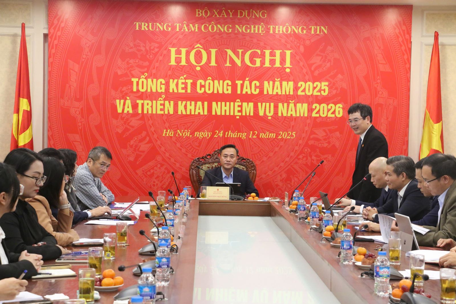 Thay mặt lãnh đạo Trung tâm CNTT, Bí thư Đảng ủy, Giám đốc Lê Thanh Tùng trân trọng cảm ơn sự quan tâm, chỉ đạo sát sao của lãnh đạo Bộ Xây dựng, sự phối hợp chặt chẽ của các cơ quan, đơn vị liên quan để Trung tâm đạt được những thành tích trong năm 2025. Giám đốc Lê Thanh Tùng khẳng định, Trung tâm sẽ nghiêm túc tiếp thu toàn diện những ý kiến chỉ đạo của Thứ trưởng tại Hội nghị và đưa vào chương trình hành động năm 2026, đồng thời hoàn thành tốt các nhiệm vụ chính trị, chuyên môn được giao, đóng góp thiết thực, hiệu quả hơn nữa cho công tác quản lý nhà nước của Bộ Xây dựng.