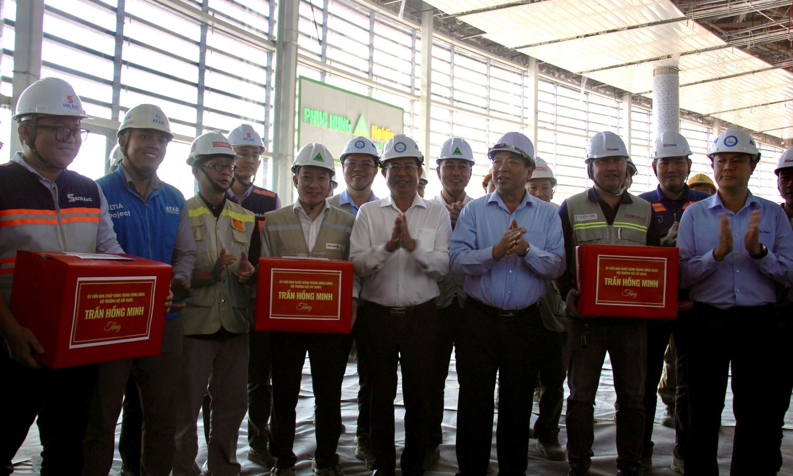 Bộ trưởng Trần Hồng Minh tặng quà cho công nhân, kỹ sư... thi công nhà ga sân bay Long Thành. Ảnh: Báo Xây dựng.