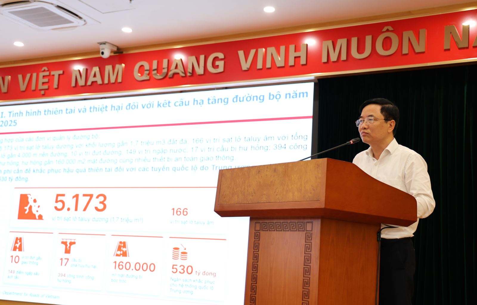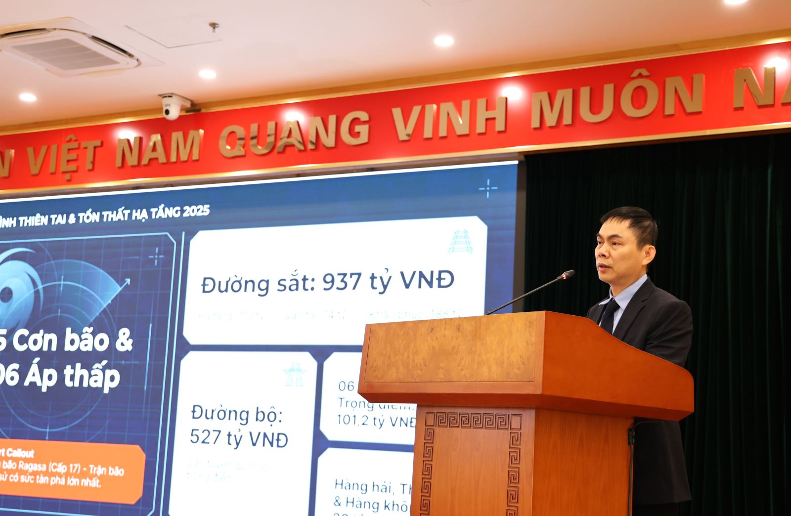 Báo cáo về công tác phòng chống thiên tai, tìm kiếm cứu nạn 2025, Phó Vụ trưởng Vụ VT&ATGT Hoàng Thế Tùng cho biết, sau mỗi đợt thiên tai, bão lũ hay mưa lớn kéo dài, Bộ Xây dựng đều có các báo cáo gửi Thủ tướng Chính phủ báo cáo sơ bộ về thiệt hại và phương án khắc phục, tổng hợp thiệt hại do thiên tai gây ra.