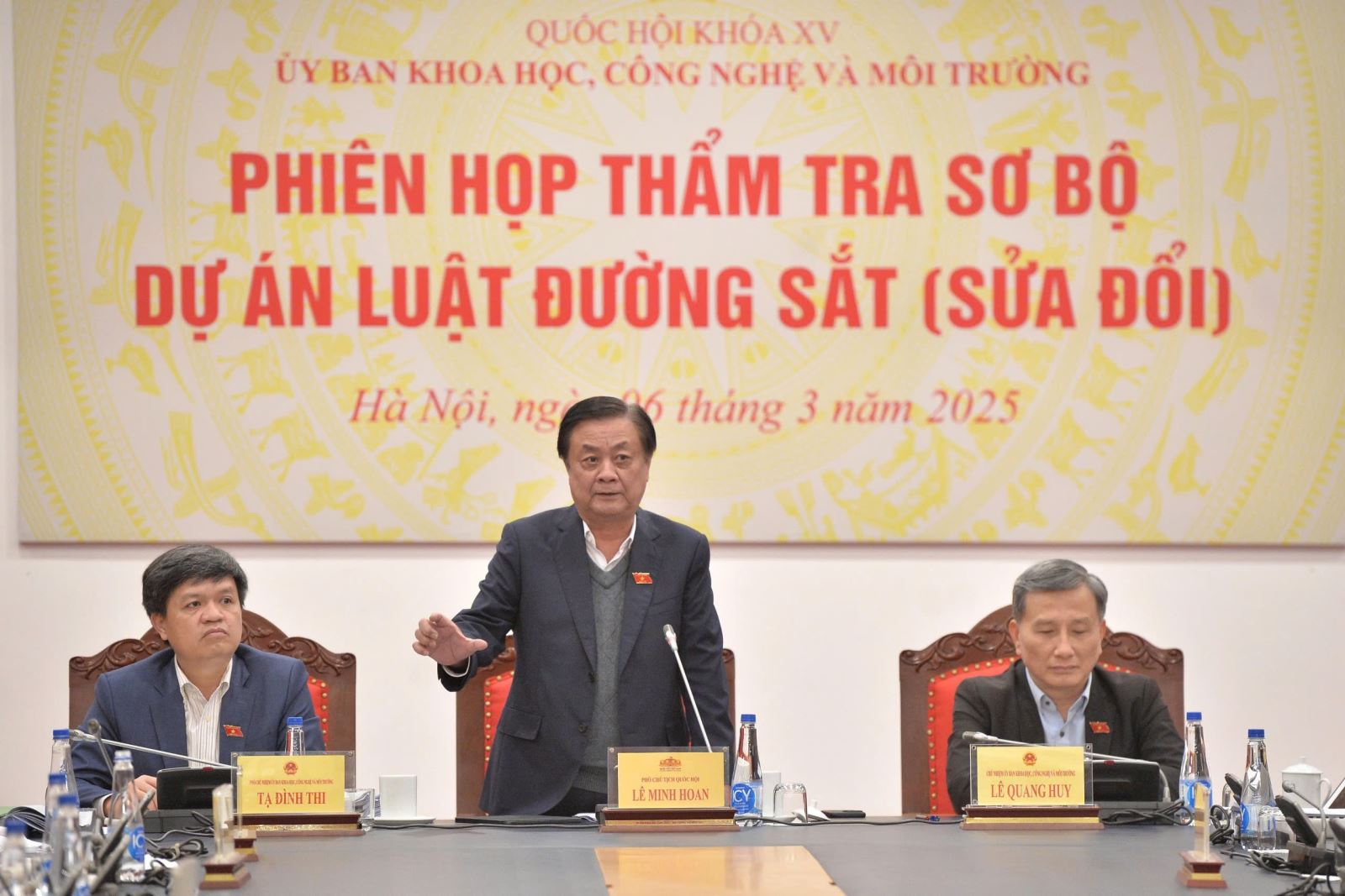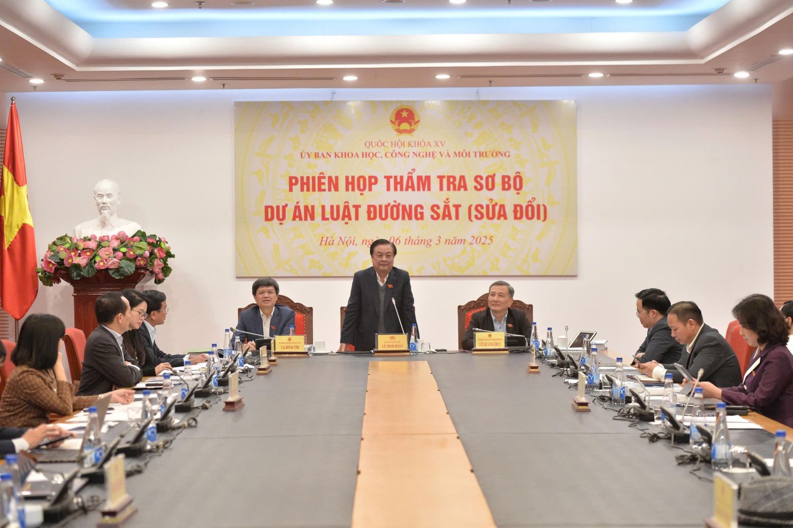 Chiều 6/3, trụ sở Văn phòng Quốc hội, dưới sự chủ trì của Ủy viên Trung ương Đảng, Chủ nhiệm Ủy ban Khoa học, Công nghệ và Môi trường Lê Quang Huy, Thường trực Ủy ban tiến hành thẩm tra sơ bộ dự án Luật Đường sắt (sửa đổi). Ủy viên Trung ương Đảng, Phó Chủ tịch Quốc hội Lê Minh Hoan đến dự và phát biểu tại phiên họp.