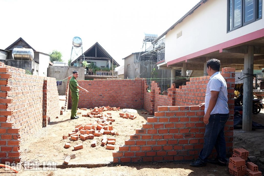Công an thị trấn Liên Sơn (huyện Lắk) kiểm tra tiến độ xây dựng nhà ở cho hộ nghèo trên địa bàn.