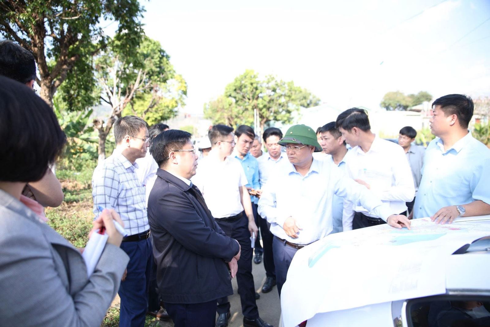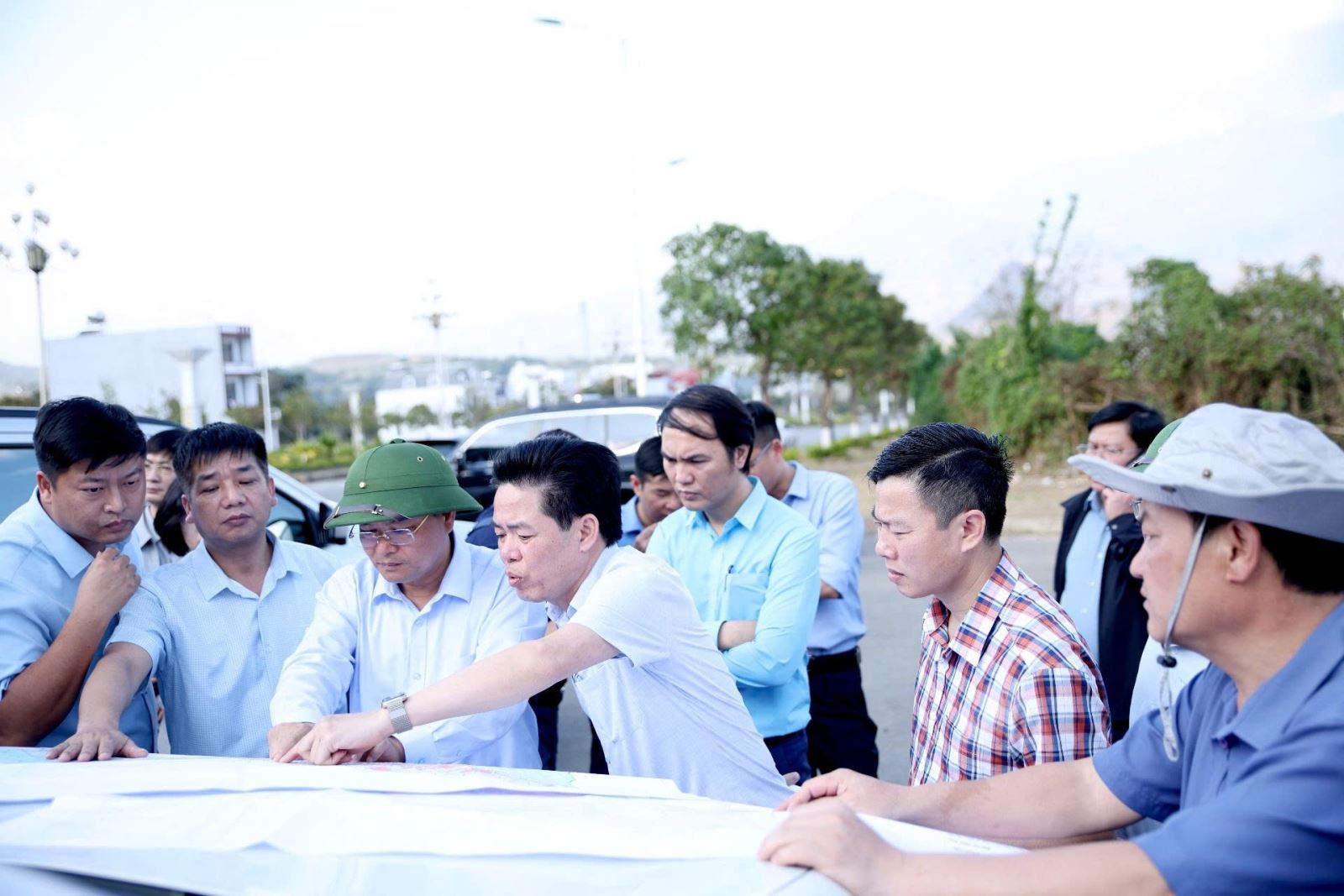Bí thư Tỉnh ủy Lê Minh Ngân xem bản đồ quy hoạch Khu đất đấu giá Khu thương mại và nhà ở Lai Châu tổ 8, phường Đoàn Kết.