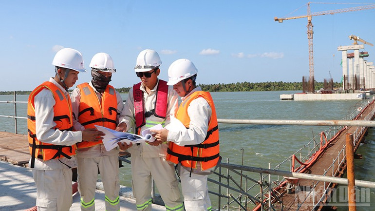 Các kỹ sư có mặt trên công trường trụ P21, cầu Đại Ngãi bắc qua sông Hậu