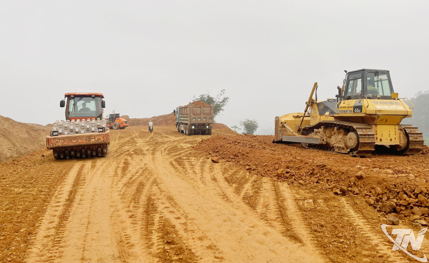 Tại công trường, không khí thi công luôn khẩn trương, sôi động. Hơn 500 kỹ sư, công nhân cùng máy móc thiết bị được huy động, triển khai đồng loạt các hạng mục. Các mũi thi công trải dài toàn tuyến, từ nền đường, cầu cống đến kết cấu mặt đường. Nhiều vị trí thi công được tổ chức hợp lý, tận dụng tối đa quỹ thời gian trong ngày để nâng cao hiệu quả.