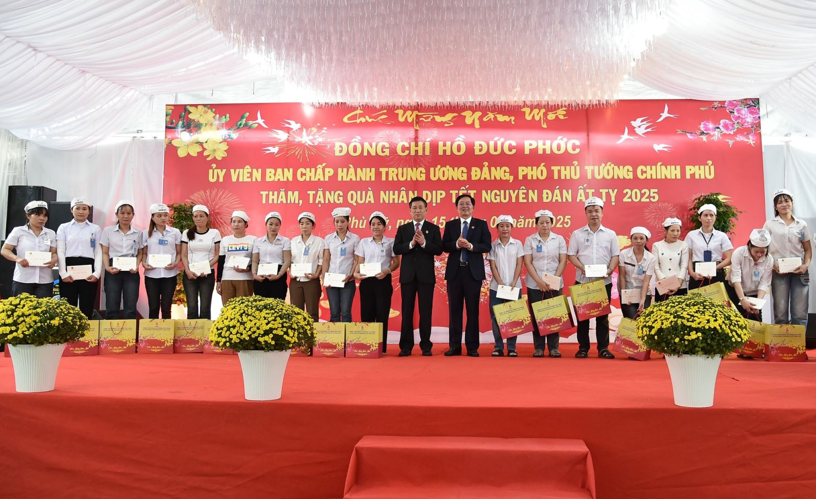 Phó Thủ tướng Hồ Đức Phớc và Bí thư Tỉnh ủy Bình Định Hồ Quốc Dũng tặng quà tết cho công nhân Nhà máy may Phú Mỹ. Ảnh VGP/Trần Mạnh