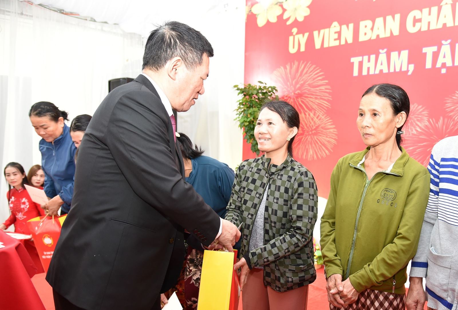 Phó Thủ tướng Hồ Đức Phớc và Bí thư Tỉnh ủy Bình Định Hồ Quốc Dũng tặng quà cho các gia đình thuộc diện nghèo, cận nghèo và công nhân có hoàn cảnh khó khăn.