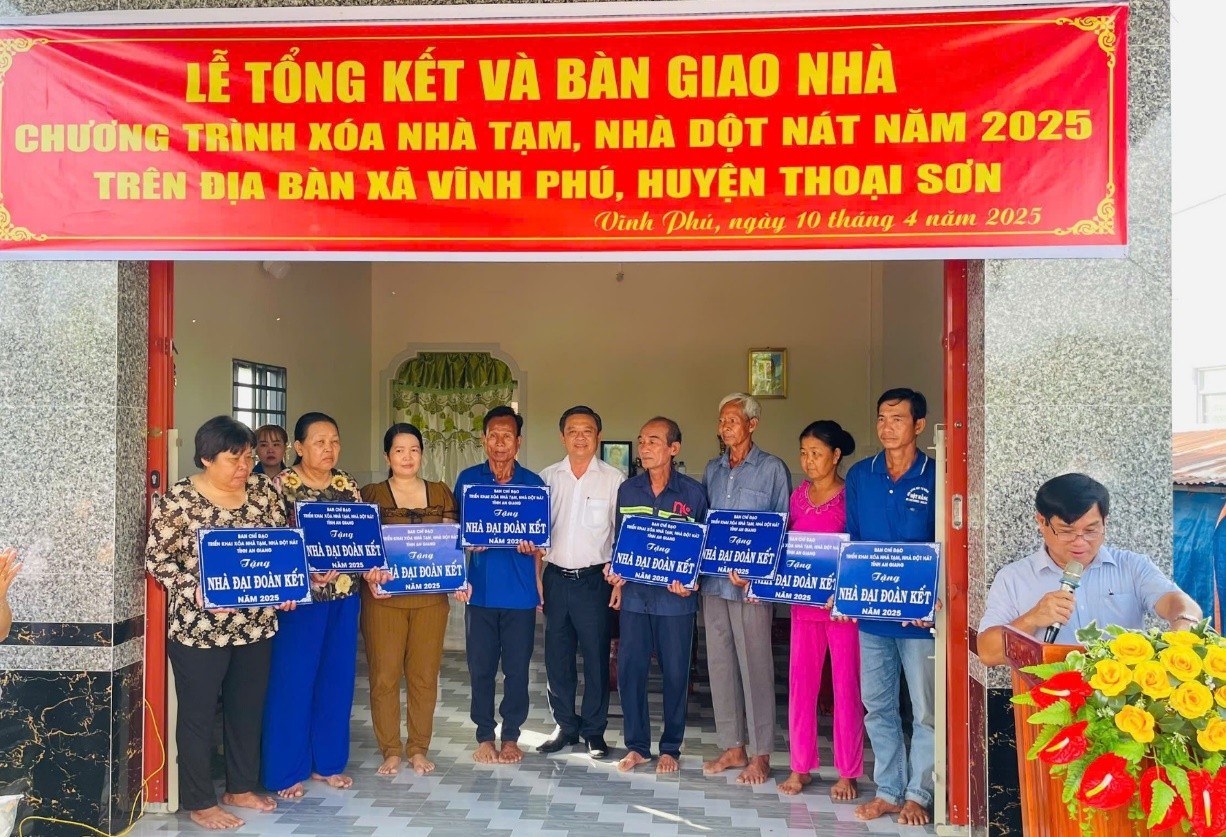 Ngày 10/4/2025, Ban Chỉ đạo xóa nhà tạm, nhà dột nát xã Vĩnh Phú (huyện Thoại Sơn) tổ chức lễ bàn giao 8 căn nhà thuộc chương trình “Xóa nhà tạm, nhà dột nát” cho các đối tượng thuộc hộ nghèo, hộ cận nghèo cần được hỗ trợ về nhà ở năm 2025 trên địa bàn xã. Phó Bí thư Huyện ủy, Chủ tịch UBND huyện Thoại Sơn Dương Ngọc Lắm cùng các đồng chí lãnh đạo chính quyền địa phương đã đến dự.