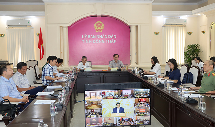 Chủ tịch Uỷ ban nhân dân tỉnh Trần Trí Quang cùng lãnh đạo các Sở, ban, ngành liên quan dự tại điểm cầu tỉnh Đồng Tháp