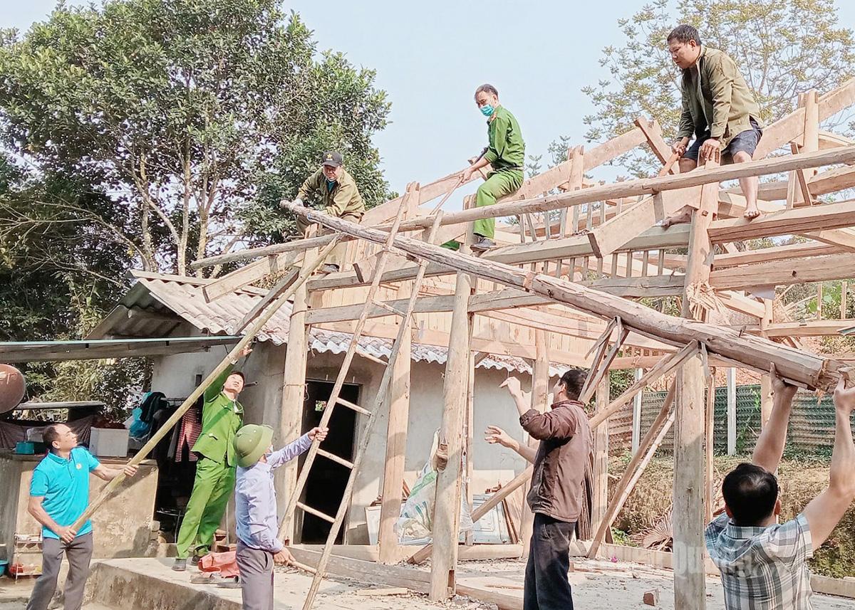 Lực lượng công an và cán bộ, công chức xã Chiêm Hóa giúp đỡ người dân tháo dỡ nhà cũ, xây dựng nhà mới.