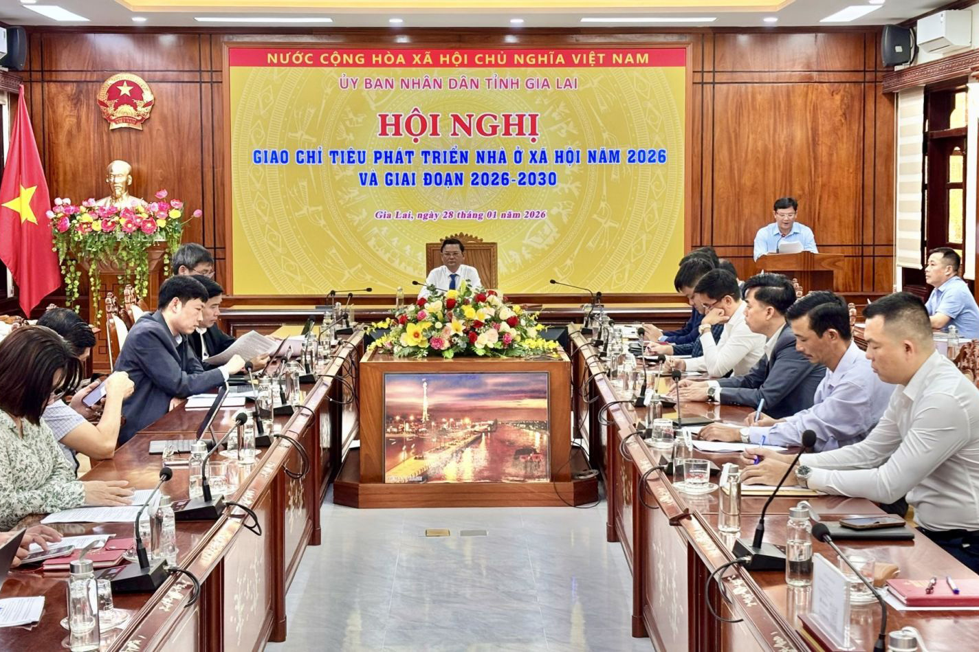 UBND tỉnh Gia Lai vừa tổ chức Hội nghị giao chỉ tiêu phát triển nhà ở xã hội (NOXH) năm 2026 và giai đoạn 2026-2030 và rà soát tiến độ triển khai các dự án NOXH trên địa bàn tỉnh. Đồng chí Nguyễn Tự Công Hoàng – Ủy viên Ban Thường vụ Tỉnh ủy, Phó Chủ tịch UBND tỉnh dự và chỉ đạo hội nghị.