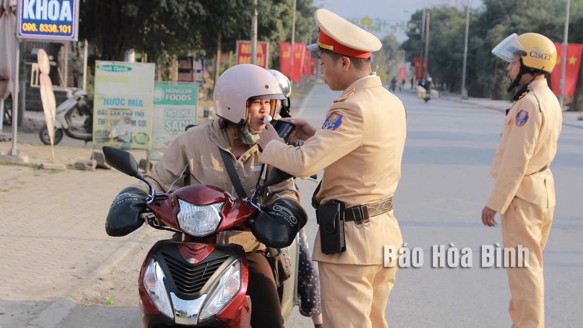 Lực lượng Cảnh sát giao thông kiểm tra nồng độ cồn người tham gia giao thông khu vực thị trấn Chi Nê (Lạc Thủy).