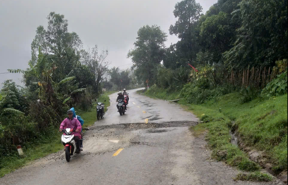 Do lượng đất đá và cây rừng tràn xuống phủ lấp gần hết nền đường nên giao thông qua đây chỉ có xe hai bánh.