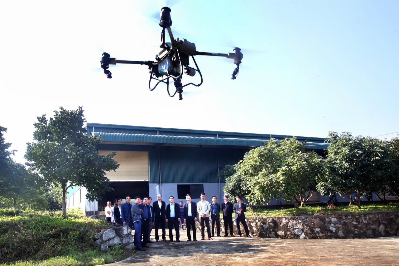 Giám đốc Sở Khoa học và Công nghệ Hà Tĩnh Lê Thành Đông cùng lãnh đạo xã Sơn Tây trải nghiệm dùng máy bay không người lái để chăm sóc cây trồng
