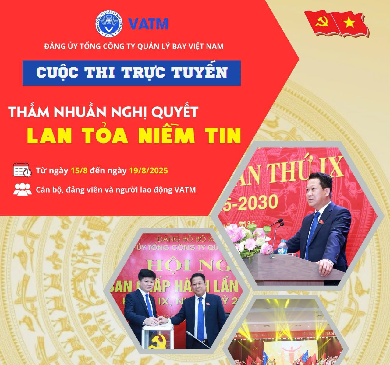 Hướng tới kỷ niệm chào mừng 80 năm Cách mạng tháng Tám (19/8/1945 - 19/8/2025) và Quốc khánh nước Cộng hòa xã hội chủ nghĩa Việt Nam (02/9/1945 - 02/9/2025), Ban Thường vụ Đảng ủy Tổng công ty Quản lý bay Việt Nam (VATM) đã ban hành Kế hoạch số 07-KH/TVĐU tổ chức Cuộc thi trực tuyến “Thấm nhuần Nghị quyết - Lan tỏa niềm tin”.