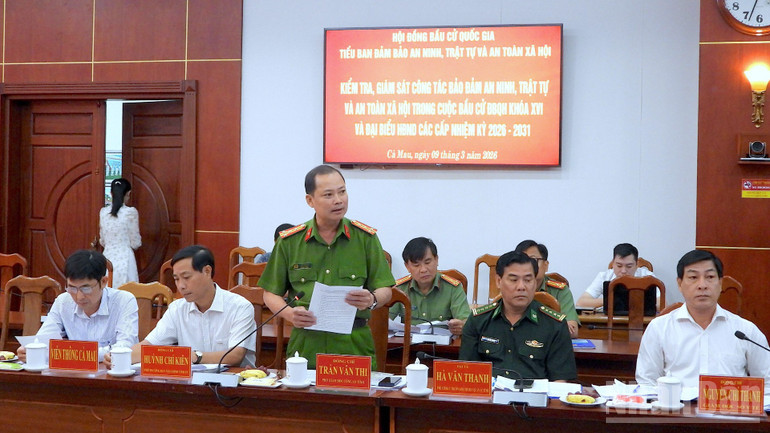 Đại tá Trần Văn Thi, Phó Giám đốc Công an tỉnh Cà Mau báo cáo về công tác phối hợp bảo đảm an ninh trật tự, phòng cháy, chữa cháy chuẩn bị cho bầu cử.