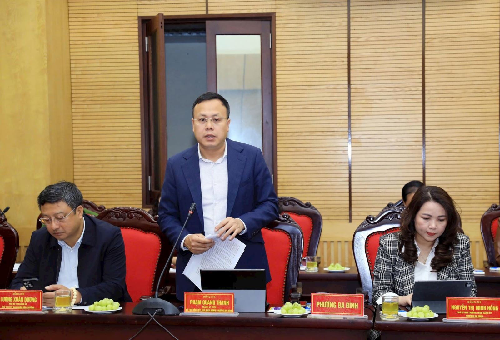 Bí thư Đảng ủy, Chủ tịch HĐND phường Ba Đình Phạm Quang Thanh báo cáo.