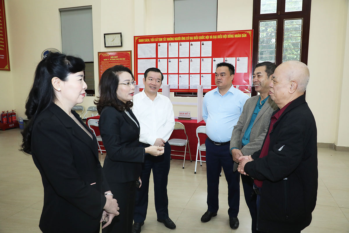 Phó Bí thư Thường trực Tỉnh ủy Nguyễn Thị Hương (thứ 2 bên trái) trao đổi với các thành viên Tổ bầu cử của Tổ dân phố Minh Khai (phường Từ Sơn)