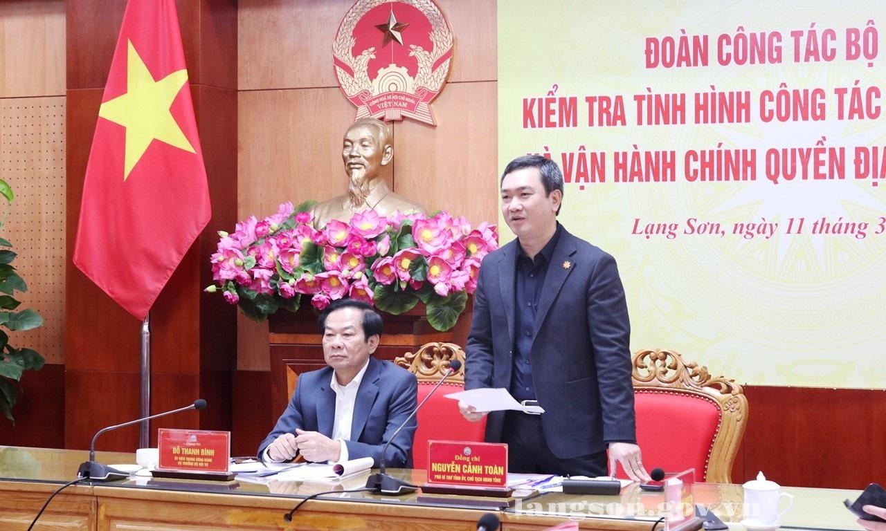 Thay mặt lãnh đạo tỉnh, đồng chí Chủ tịch UBND tỉnh Lạng Sơn Nguyễn Cảnh Toàn tiếp thu ý kiến chỉ đạo của đồng chí Bộ trưởng Bộ Nội vụ và các thành viên đoàn công tác. Đồng chí khẳng định cấp ủy, chính quyền các cấp của tỉnh tiếp tục triển khai nghiêm túc, hiệu quả, đúng quy định về công tác bầu cử và vận hành mô hình chính quyền địa phương hai cấp. Đồng thời mong muốn các bộ, ngành Trung ương quan tâm, giúp đỡ tỉnh thực hiện tốt các nhiệm vụ trong thời gian tới.