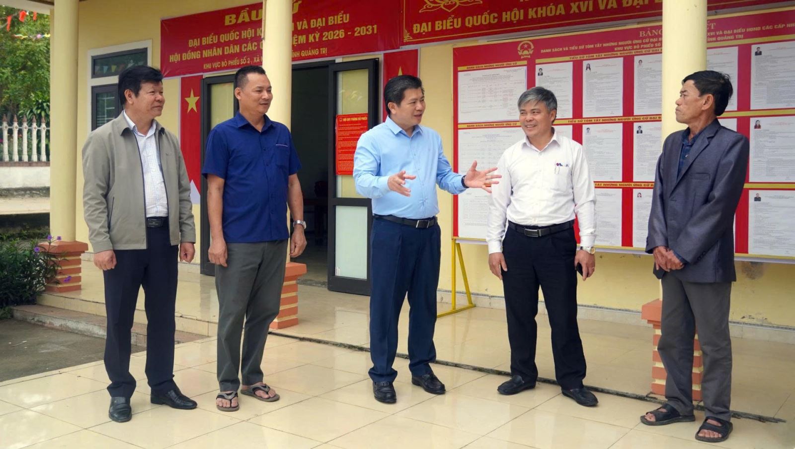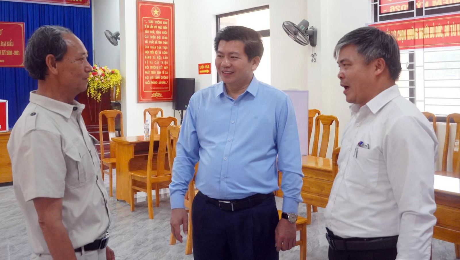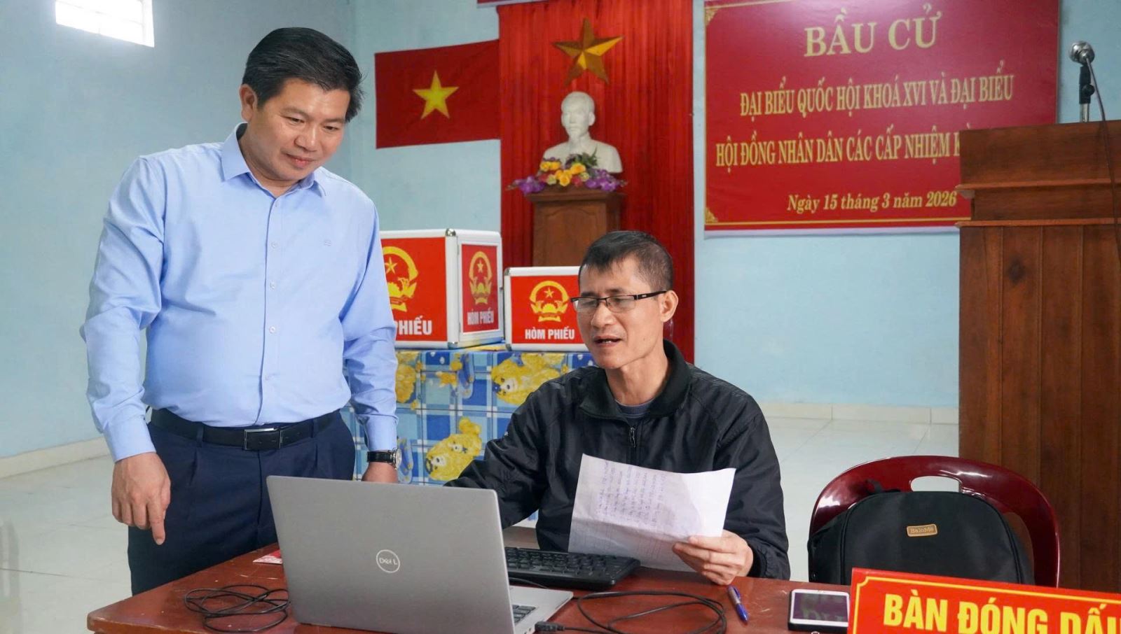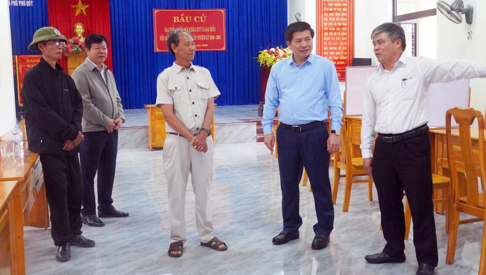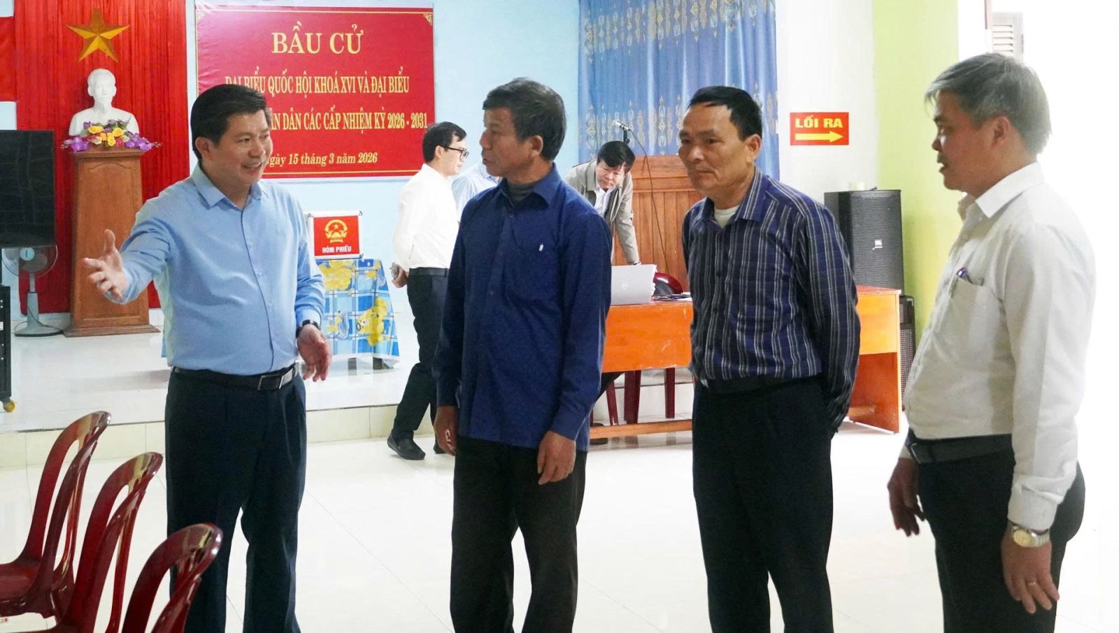 Đồng chí Phó Bí thư Thường trực Tỉnh ủy Trần Vũ Khiêm đã kiểm tra tại khu vực bỏ phiếu số 1 (gồm các tổ dân phố Quyết Tiến và Phú Quý); khu vực bỏ phiếu số 2 (gồm các tổ dân phố 3, Thắng Lợi và Ban Chỉ huy Quân sự xã); khu vực bỏ phiếu số 3 (tổ dân phố Chiến Thắng và bản Khe Ngát).