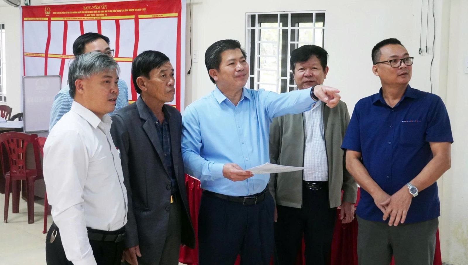 Đồng chí Trần Vũ Khiêm, Phó Bí thư Thường trực Tỉnh ủy, Phó trưởng Ban Chỉ đạo bầu cử tỉnh kiểm tra công tác chuẩn bị bầu cử tại khu vực bỏ phiếu số 1, xã Nam Trạch