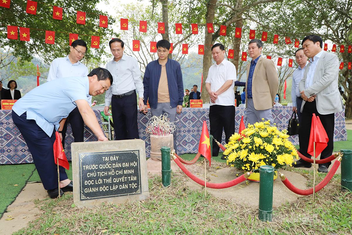 Bí thư Tỉnh ủy Hầu A Lềnh kiểm tra công tác trang trí tại khu vực Bia đá - Nơi Chủ tịch Hồ Chí Minh đọc lời thề quyết tâm giành độc lập dân tộc.