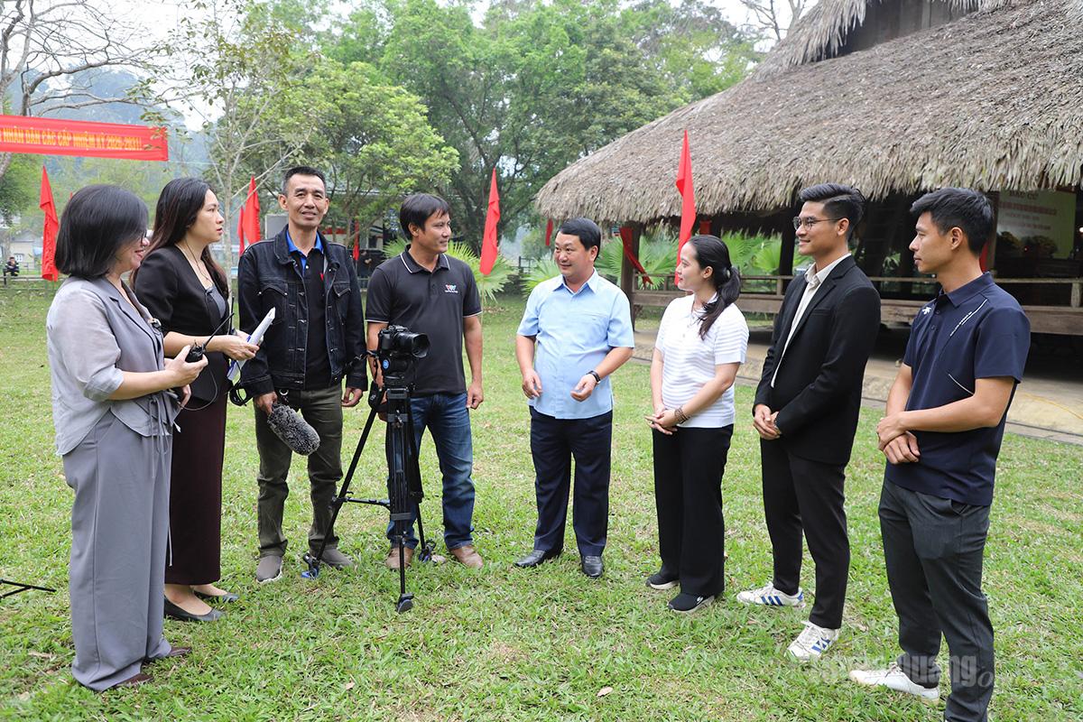 Bí thư Tỉnh ủy Hầu A Lềnh trao đổi với phóng viên, biên tập viên của các cơ quan báo chí Trung ương và tỉnh Tuyên Quang về công tác tuyên truyền về ngày bầu cử.