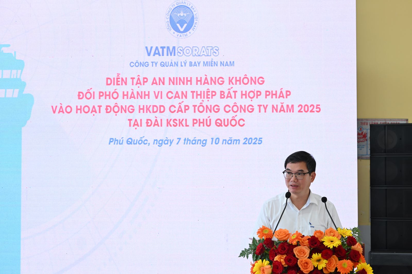 Phát biểu khai mạc, ông Nguyễn Văn Tiến - Phó Tổng Giám đốc Tổng công ty Quản lý bay Việt Nam, Trưởng Ban Chỉ đạo diễn tập nhấn mạnh: “An ninh hàng không là ưu tiên hàng đầu của mọi quốc gia, đặc biệt trong bối cảnh các nguy cơ đe dọa ngày càng phức tạp, khó lường. Đài Kiểm soát không lưu Phú Quốc giữ vai trò then chốt trong điều phối hoạt động bay khu vực phía Nam, đồng thời là vị trí chiến lược về an ninh quốc gia, nhất là khi Phú Quốc được lựa chọn là địa điểm tổ chức Hội nghị APEC 2027.