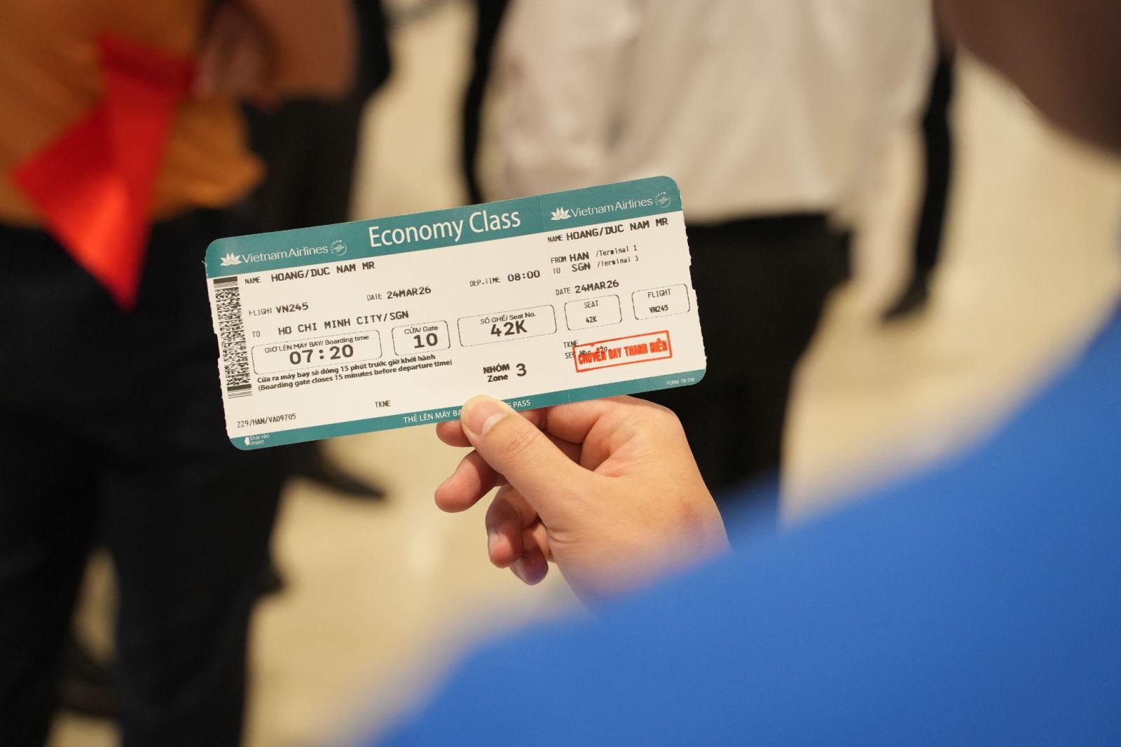 Từng tấm thẻ lên tàu bay được đóng dấu xác nhận "Chuyến bay Thanh niên" như một món quà nhỏ nhưng ý nghĩa, giúp hành khách lưu giữ dấu mốc của một hành trình đặc biệt.