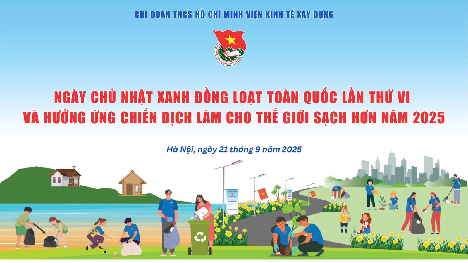 Thực hiện chương trình công tác Đoàn và phong trào thanh niên năm 2025, để chào mừng thành công Đại hội Đoàn Thanh niên các đơn vị trực thuộc Đoàn Bộ Xây dựng, sáng ngày 21/9/2025, Đoàn Thanh niên Viện Kinh tế xây dựng tổ chức ra quân hưởng ứng Ngày Chủ nhật xanh toàn quốc lần thứ VI và Chiến dịch “Làm cho thế giới sạch hơn năm 2025”.