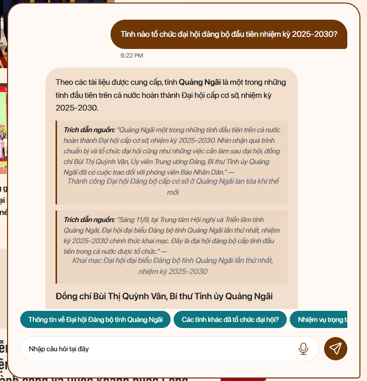 Công cụ tìm kiếm thông minh tích hợp trí tuệ nhân tạo (tức chatbot), cho phép người dùng đặt câu hỏi tự nhiên và nhận câu trả lời chính xác, trích xuất trực tiếp từ các tài liệu chính thống về Đảng Cộng sản Việt Nam, các tư liệu, văn kiện của các kỳ Đại hội.