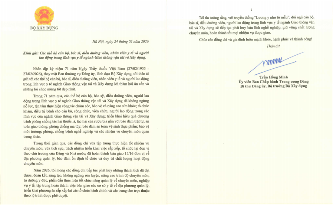 Nhân dịp năm mới 2026 và đón Xuân Bính Ngọ, Bộ trưởng Bộ Xây dựng Trần Hồng Minh đã gửi thư chúc Tết cán bộ, công chức, viên chức, người lao động ngành Xây dựng. Cổng Thông tin điện tử Bộ Xây dựng xin trân trọng đăng toàn văn Thư của Bộ trưởng Trần Hồng Minh.