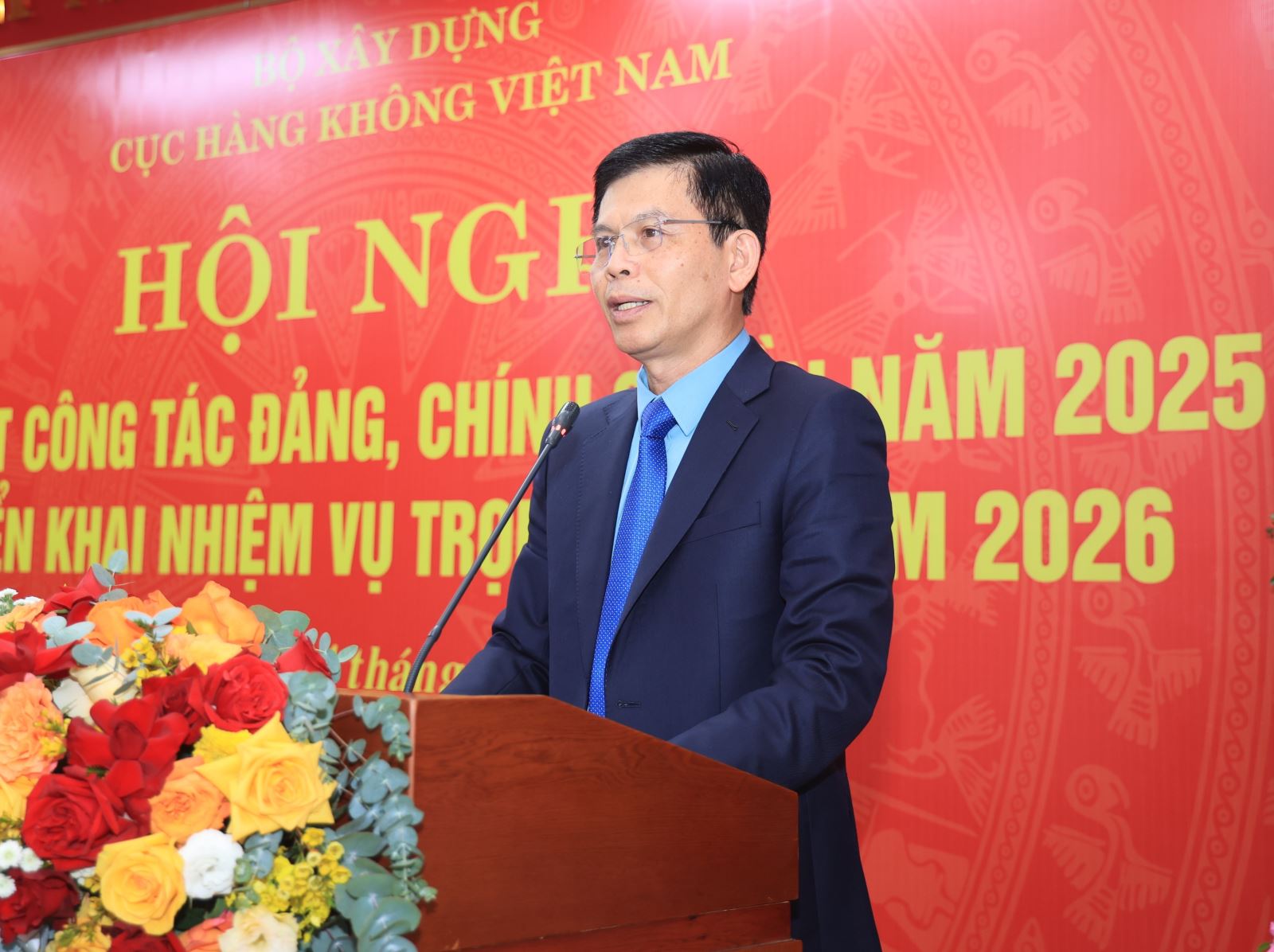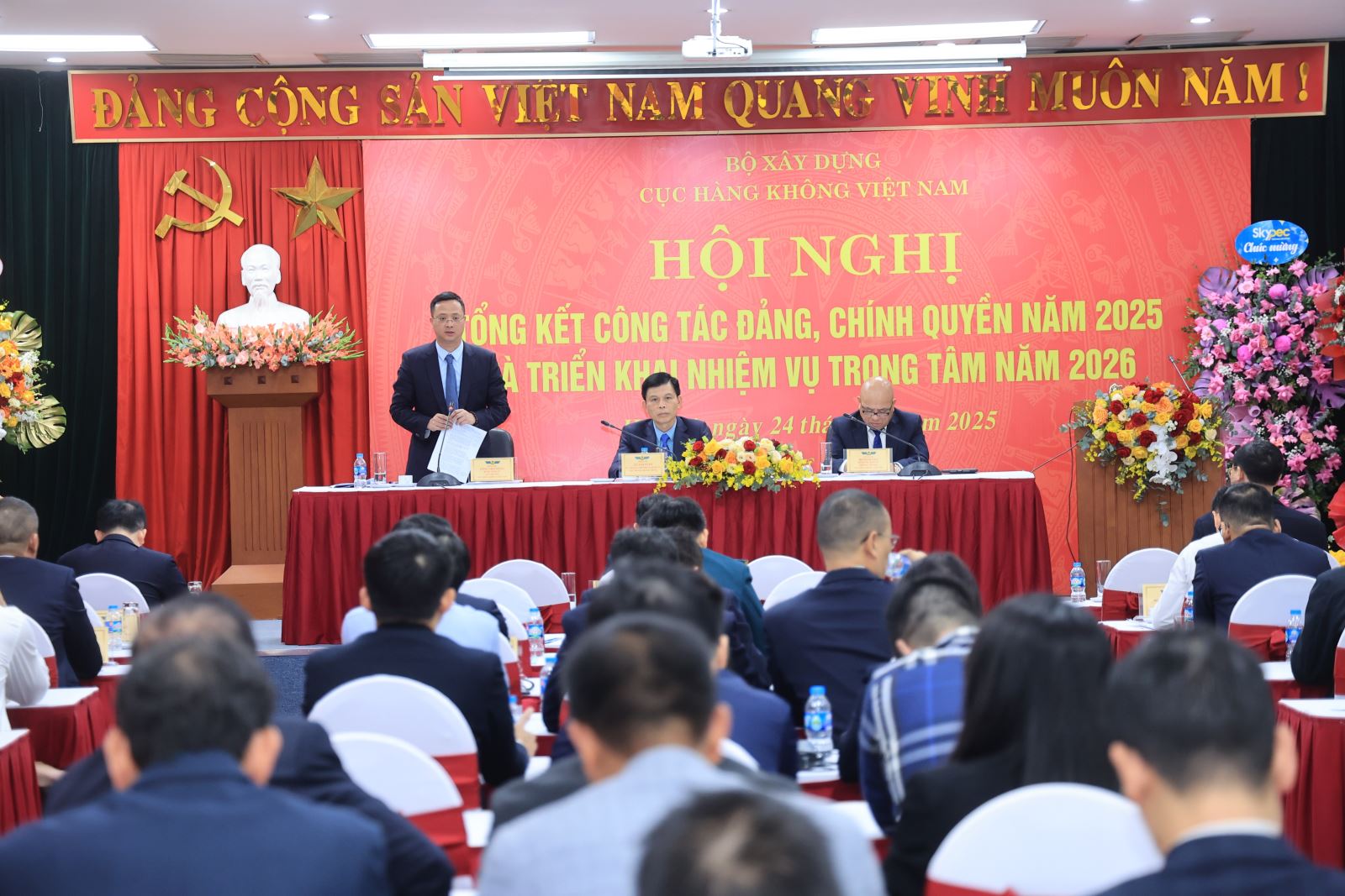 Trước đó, báo cáo tại Hội nghị, Phó Cục trưởng Cục Hàng không Việt Nam Hồ Minh Tấn cho biết: Năm 2025, được sự quan tâm, chỉ đạo sát sao, trực tiếp, toàn diện của Đảng ủy, Lãnh đạo Bộ Xây dựng, Cục Hàng không đã tổ chức triển khai thực hiện kịp thời, quyết liệt, linh hoạt và hiệu quả các nhiệm vụ được giao; được Ban Thường vụ Đảng ủy Bộ Xây dựng ghi nhận, đánh giá cao, trong đó có nhiều kết quả nổi bật.