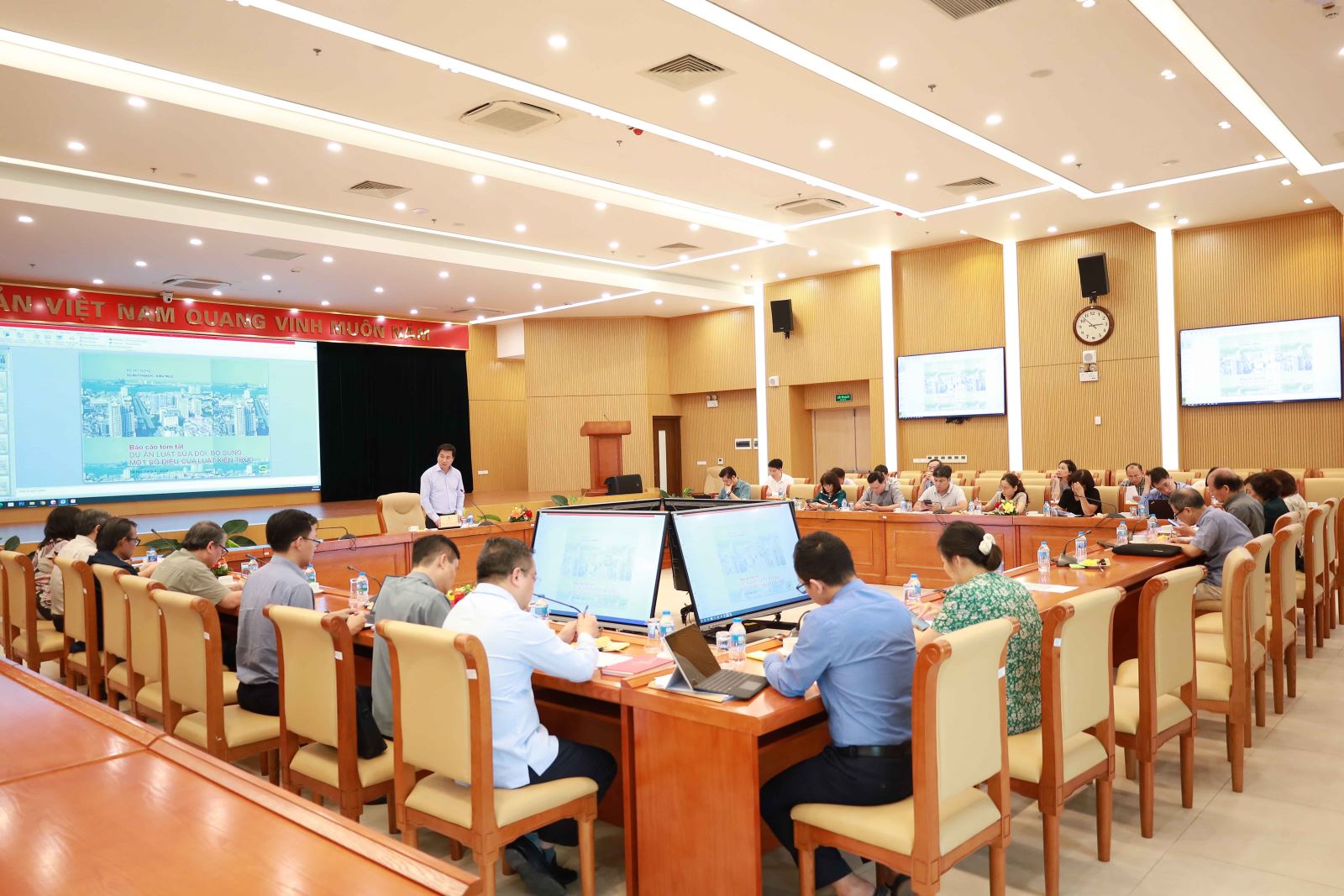 Ngày 23/4/2026, tại Hà Nội, Thứ trưởng Nguyễn Tường Văn - Tổ tưởng Tổ soạn thảo chủ trì cuộc họp Tổ soạn thảo Luật Sửa đổi, bổ sung một số điều của Luật Kiến trúc năm 2019. Dự cuộc họp có thành viên Tổ soạn thảo gồm: đại diện lãnh đạo Sở Quy hoạch kiến trúc các Thành phố trực thuộc Trung ương, lãnh đạo các đơn vị thuộc Bộ Xây dựng, chuyên gia các hội, hiệp hội nghề nghiệp chuyên ngành.