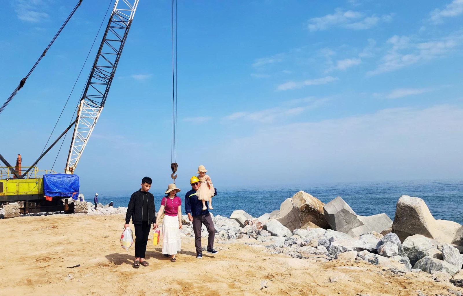 Anh Đào Bá Linh, cán bộ kỹ thuật Công ty TNHH Thương mại và Dịch vụ xây dựng Linh Hà, một trong những doanh nghiệp tham gia thi công dự án, dẫn chúng tôi đi thăm đại công trường. Bên biển xanh, giữa thảm nắng xuân vàng vương khắp đất trời, chúng tôi cảm nhận rõ không khí lao động khẩn trương, tấp nập. Hàng trăm công nhân chia “3 ca, 4 kíp” liên tục thay nhau chạy đua cùng thời gian để bảo đảm công trình luôn thông suốt.