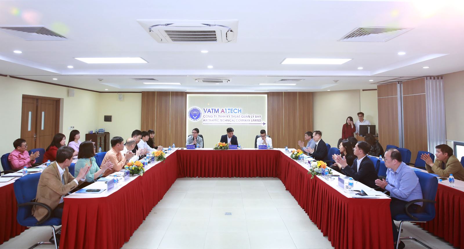 Đại diện các đơn vị trong Khối thi đua 26 ký Giao ước thi đua năm 2026 trước sự chứng kiến của Lãnh đạo Bộ Xây dựng và Lãnh đạo Tổng công ty Quản lý bay Việt Nam. Ảnh: VATM