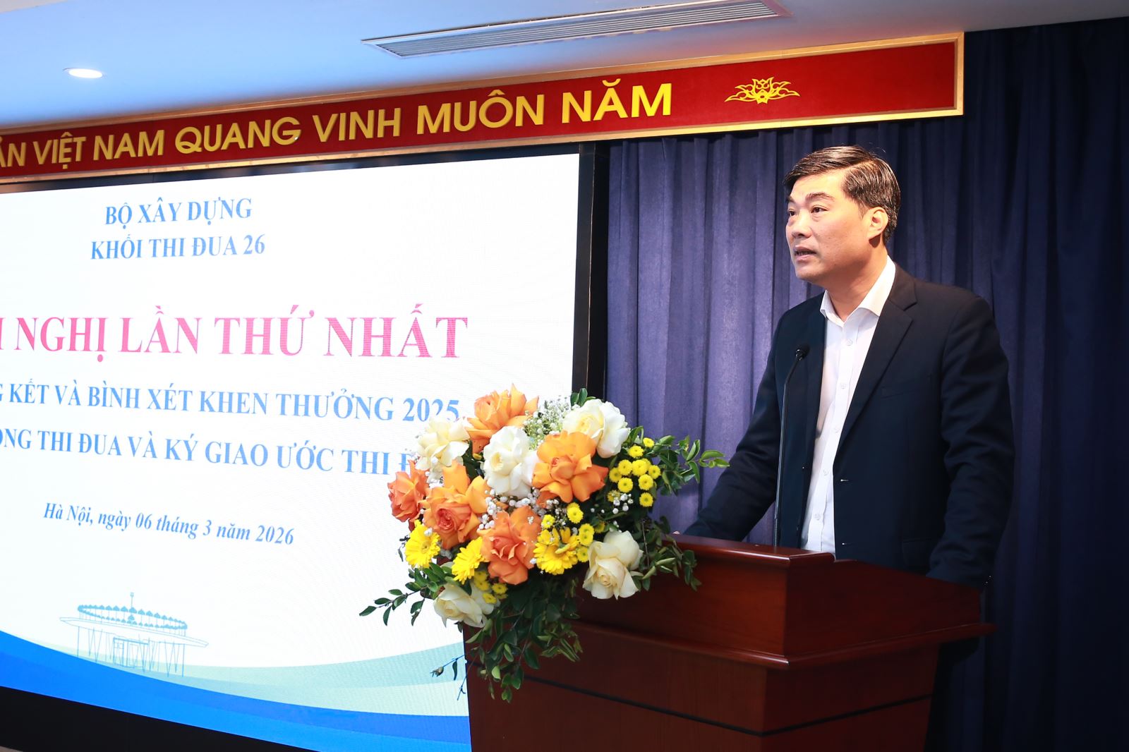 Thay mặt Khối thi đua 26, ông Nguyễn Hoàng Giang xin nghiêm túc tiếp thu đầy đủ các ý kiến chỉ đạo của lãnh đạo Bộ Xây dựng, Tổng công ty Quản lý bay Việt Nam tại Hội nghị.