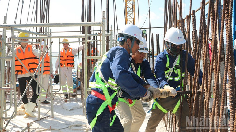 Công nhân đang thi công hạng mục trụ P21, cầu Đại Ngãi bắc qua sông Hậu